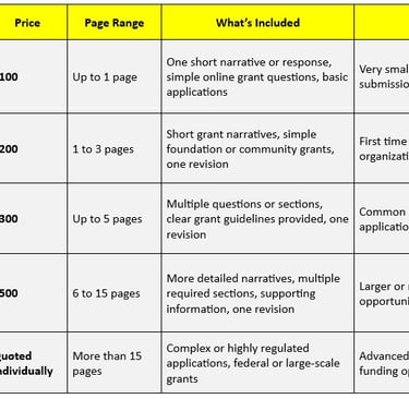 Each pricing level is based on the amount of writing needed, the overall complexity of the application, and the level of detail required by the funding source.